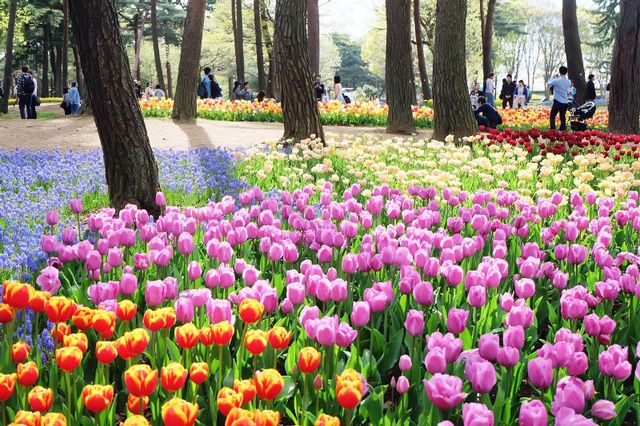Ở Showa Kinen, hoa tulip được trồng không chỉ rải rác mà còn khiến du khách mãn nhãn với những thảm hoa tulip vô cùng rực rỡ. Muôn sắc hoa tulip được trồng theo sắc độ vô cùng mát mắt. Tại đây, từ cuối tháng 3 đến cuối tháng 5, lễ hội hoa tulip và triển lãm hoa được tổ chức để du khách cũng như người dân được ngắm loài hoa tulip trên phong thổ đất Nhật. Hoa tulip sẽ được trang trí thành bức tường, cây cầu hay con đường hoa nên bạn sẽ tha hồ có được những bức ảnh đẹp. Không chỉ ngắm đủ các loại hoa mà du khách còn được chiêu đãi bàn tiệc các loại hoa rực rỡ khác như hoa mỹ nhân, hoa chuông tím, hoa tủy tiên vàng…Đúng là được cho được cả gói mang về!
