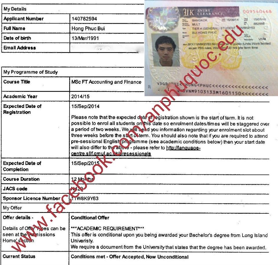 Với bảng thành tích xuất sắc về chuyên ngành tài chính từ khóa đại học tại Long Island University (Mỹ), An Phú Quốc đã hỗ trợ sinh viên Bùi Hồng Phúc đăng ký khóa học thạc sỹ tại ngôi trường danh tiếng Queen Mary này. Phúc đã nhanh chóng nhận được thư mời từ trường và An Phú Quốc tiếp tục hỗ trợ Phúc xin thành công visa.