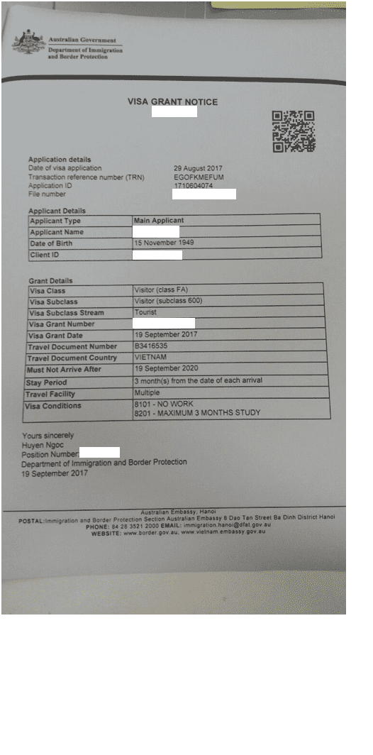 Sự chuyên nghiệp của An Phú Quốc trong việc xin thành công Visa du học Úc cho hai em B.Linh và B.Chi, đã tạo được lòng tin và sự tín nhiệm đối với gia đình của hai em. Sau khi nhận được Visa du học, sự quay trở lại lần này của gia đình là nguyện vọng xin Visa cho người thân để đưa hai em B.Linh và B.Chi qua Úc du học, nên rất mong muốn An Phú Quốc gấp rút chuẩn bị hồ sơ xin Visa đi Úc cho ông ngoại của hai em là bác Vũ Thế Vinh.