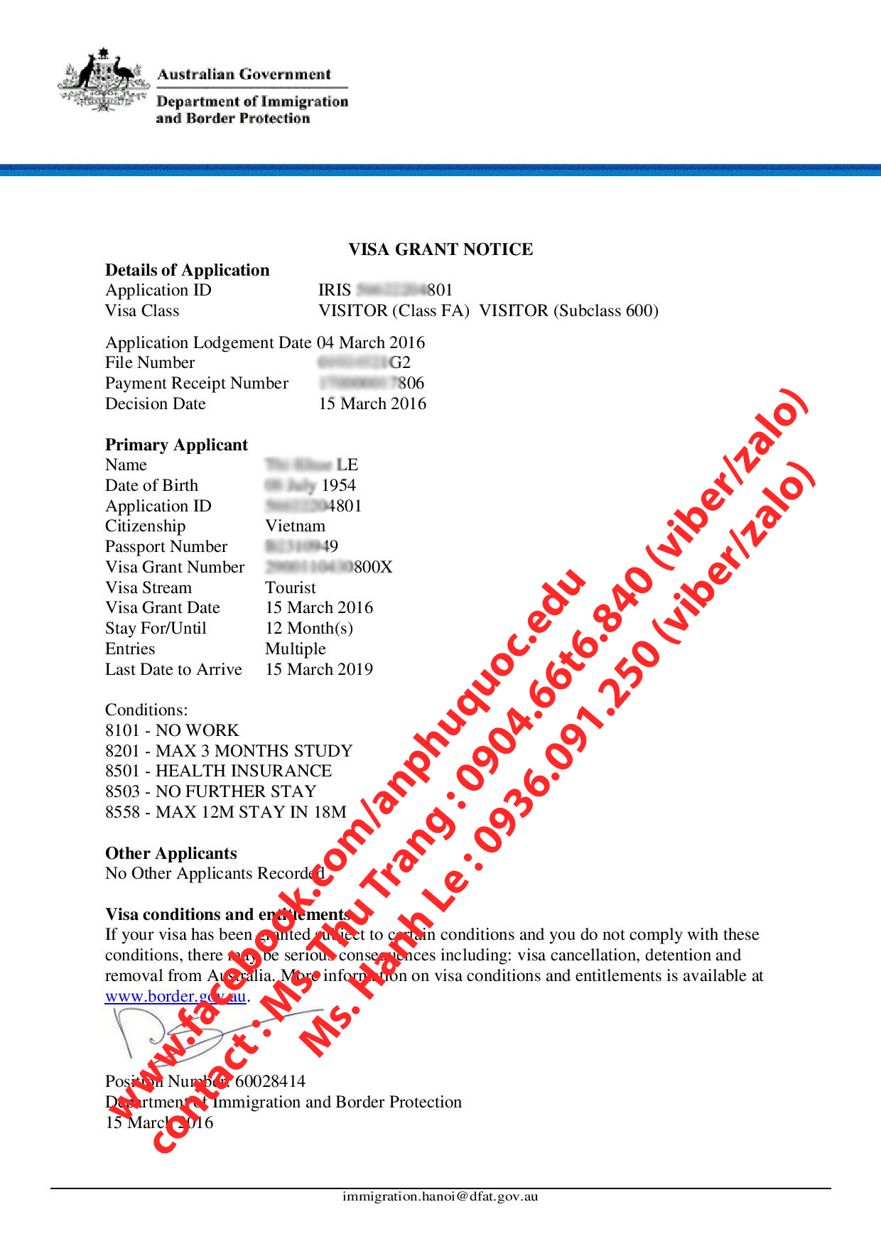 An Phú Quốc xin chúc mừng cô Lê Thị Khuê và gia đình đã đạt visa du lịch Úc với thời hạn 3 năm